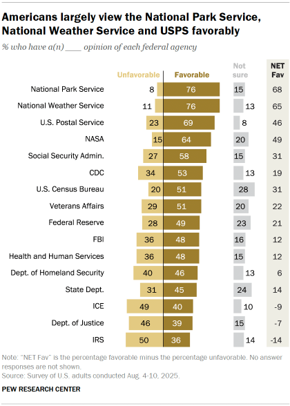In contrast, the National Park Service has the highest favorability rating. Yes, they do a good job of keeping our national parks accessible to all of us and we appreciate this when we travel to a national park. People see the park service as a government agency that actually provides a valuable service. Of course, the National Park Service doesn’t make us complete onerous and confusing forms justifying why we are going to the national park before we can enter the park.