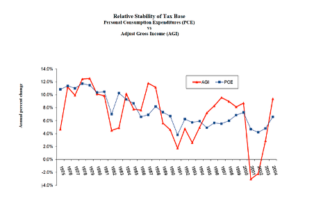 Ed: Social Security and Medicare are already facing insolvency. Benefits will drop 21% in 2023 if Congress fails to act now. Switching the funding base for these vital programs from payroll to consumption assures a more stable and growing base. The following graph shows that the volatility of personal consumption is far less than adjusted gross income, which tracks closely with payroll.
